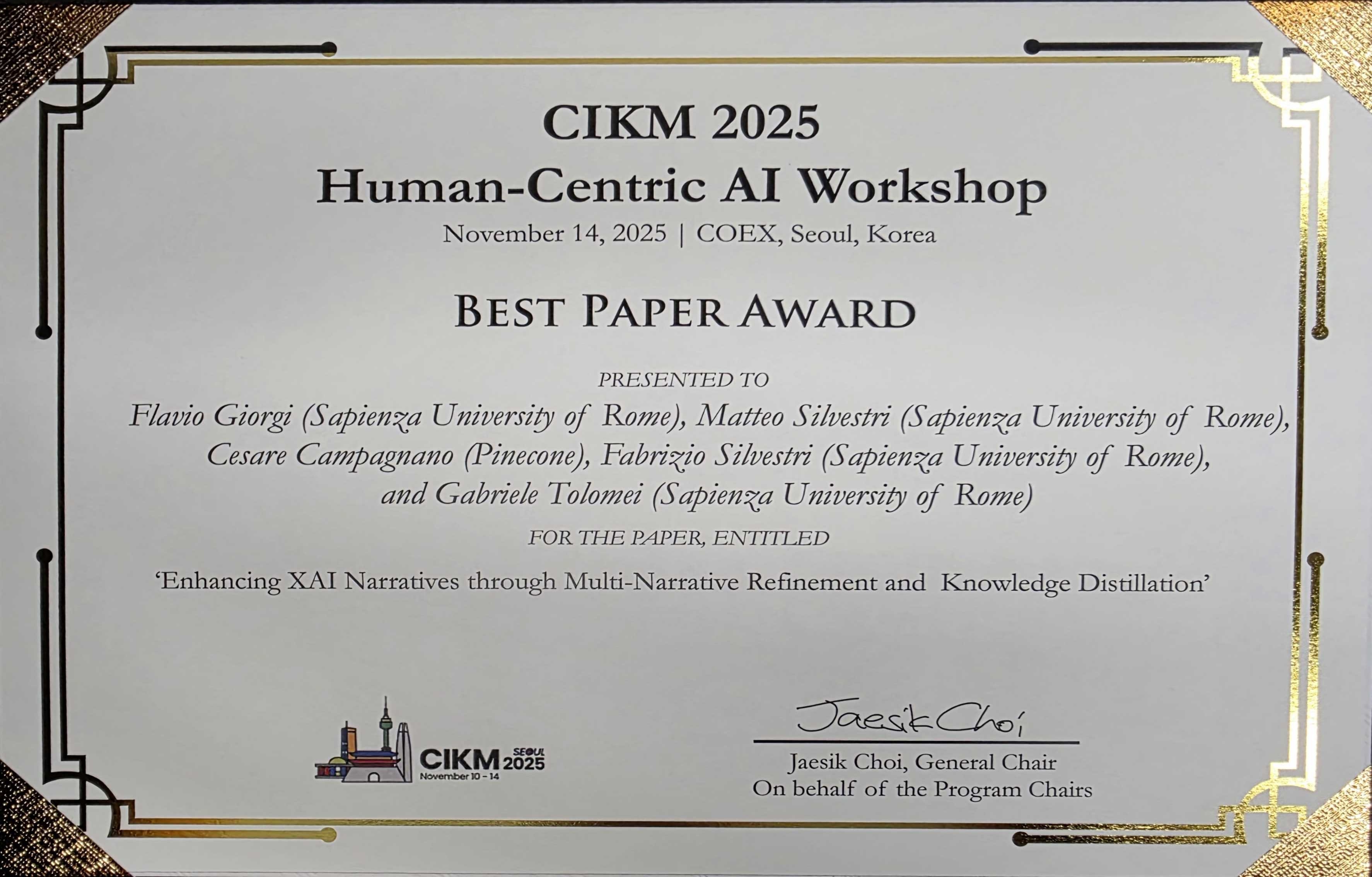 L'articolo “Enhancing XAI Narratives through Multi-Narrative Refinement and Knowledge Distillation”, di Flavio Giorgi, Matteo Silvestri e Gabriele Tolomei del Dipartimento di Informatica, in collaborazione con Fabrizio Silvestri (DIAG) e Cesare Campagnano, ha ricevuto il Best Paper Award all'HCAI 2025 Workshop (Human-Centric AI: From Explainability and Trustworthiness to Actionable Ethics), co-locato con il convegno internazionale ACM CIKM 2025 a Seoul, Corea.